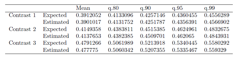The simulation study simulates responses from a four condition counter balanced design, with p = 48 participants and q = 24 stimuli/items. Here, we will focus on expected and assurance MOE for three contrasts. The first contrast estimates the difference between the first mean and the average of the other three, the second contrast the difference between the second mean and the average of the third and fourth means, and the final contrast the difference between the means of the third and fourth contrasts.